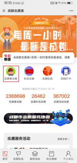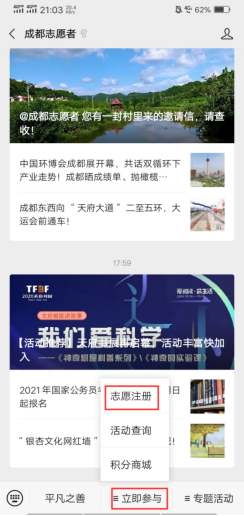 步骤一:关注“成都志愿者”微信公众号,点击下方“立即参与”,“志愿注册”。