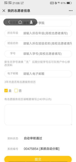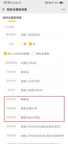 步骤三:填写我的志愿者信息。注:所在区县“郫都区”,所属高校“永利官网地址”,所在院系“建筑与设计学院”。全部填写完成后点击最下方“提交”。
